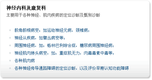 在臨床醫(yī)學上,電生理檢查是神經(jīng)系統(tǒng)檢查的延伸,是組織化學、生物化學及基因等檢測不可替代的檢測技術。用于確定周圍神經(jīng)肌肉系統(tǒng)和中樞神經(jīng)系統(tǒng)的功能狀態(tài)及可疑病變,檢出亞臨床病灶,對病損精確定位。對周圍神經(jīng)疾病、脊髓病、脫髓鞘病、頸椎病、糖尿病、各類神經(jīng)損傷、康復治療評價、感覺及運動功能評價等的診察確定。目前廣泛應用于神經(jīng)內(nèi)外科、手外科、骨科、小兒科、康復科、內(nèi)分泌科、肛腸科、耳科、眼科、泌尿科、性功能科、法醫(yī)鑒定、職業(yè)病及運動醫(yī)學等。